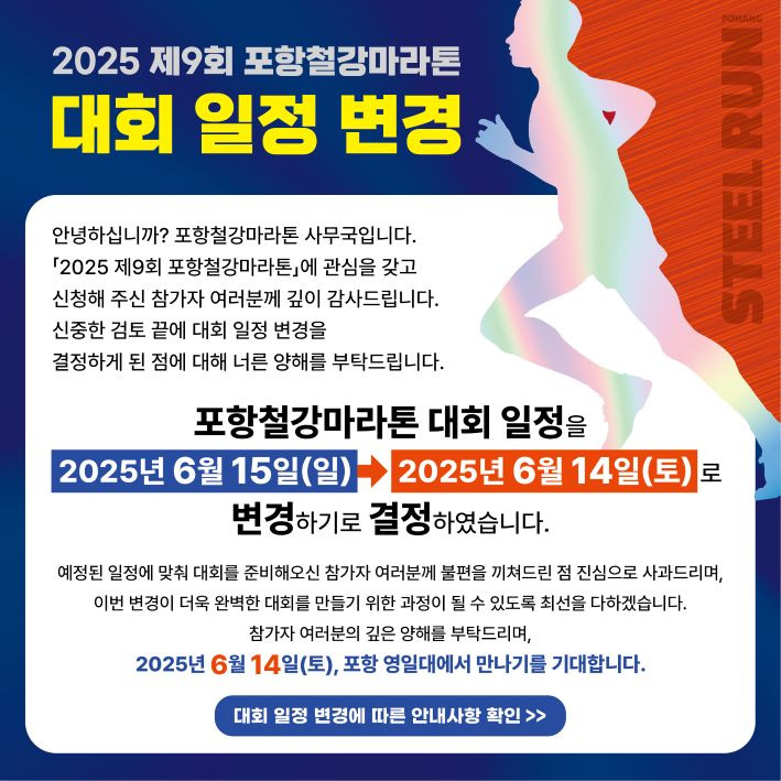 이번 포항 철강 마라톤에 많은 관심과 참여 부탁드립니다. 여러분의 열정이 모여 더욱 특별한 대회가 되기를 기대합니다.